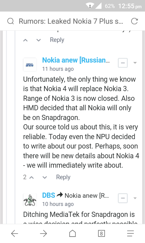 By: Amal Prabhakaran https://nokiamob.net/tip-us/#comment-54230 Sun, 04 Feb 2018 07:49:00 +0000 http://nokiamob.net/?page_id=33#comment-54230 Nokia 4 is going to replace Nokia 3. First leak about the Nokia 4. Also, future Nokia smartphones would only have Snapdragon processors, because of the issue with software updates faced by Nokia 3 due to the MediaTek chipset. From this, we can guess the Nokia 4 to feature a SD450 chipset. Nokia 3 production has been stopped. This is also confirmed by the source(from Russia) itself in the comments section of the new post about the Nokia 7 Plus. https://uploads.disquscdn.com/images/5423221858a40a3c7350892647d722c0a312147f2dc672a8161f52ab629449ee.png